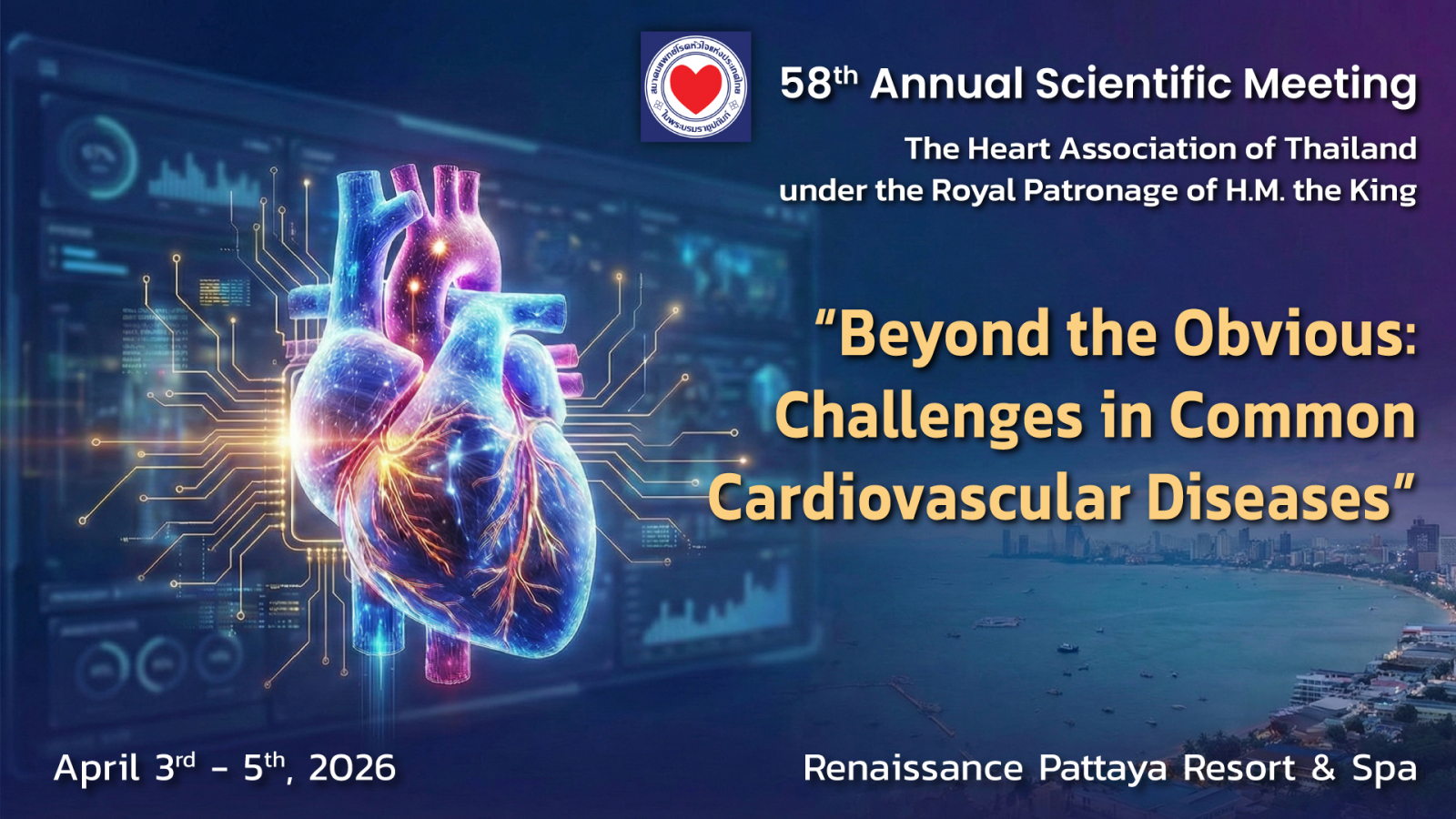 On behalf of The Heart Association of Thailand under the Royal Patronage of H.M. the King, it is my great pleasure to invite you to our 58th Annual Scientific Meeting scheduled to convene during 3-5 April 2026 at Renaissance Pattaya Resort & Spa, Thailand.